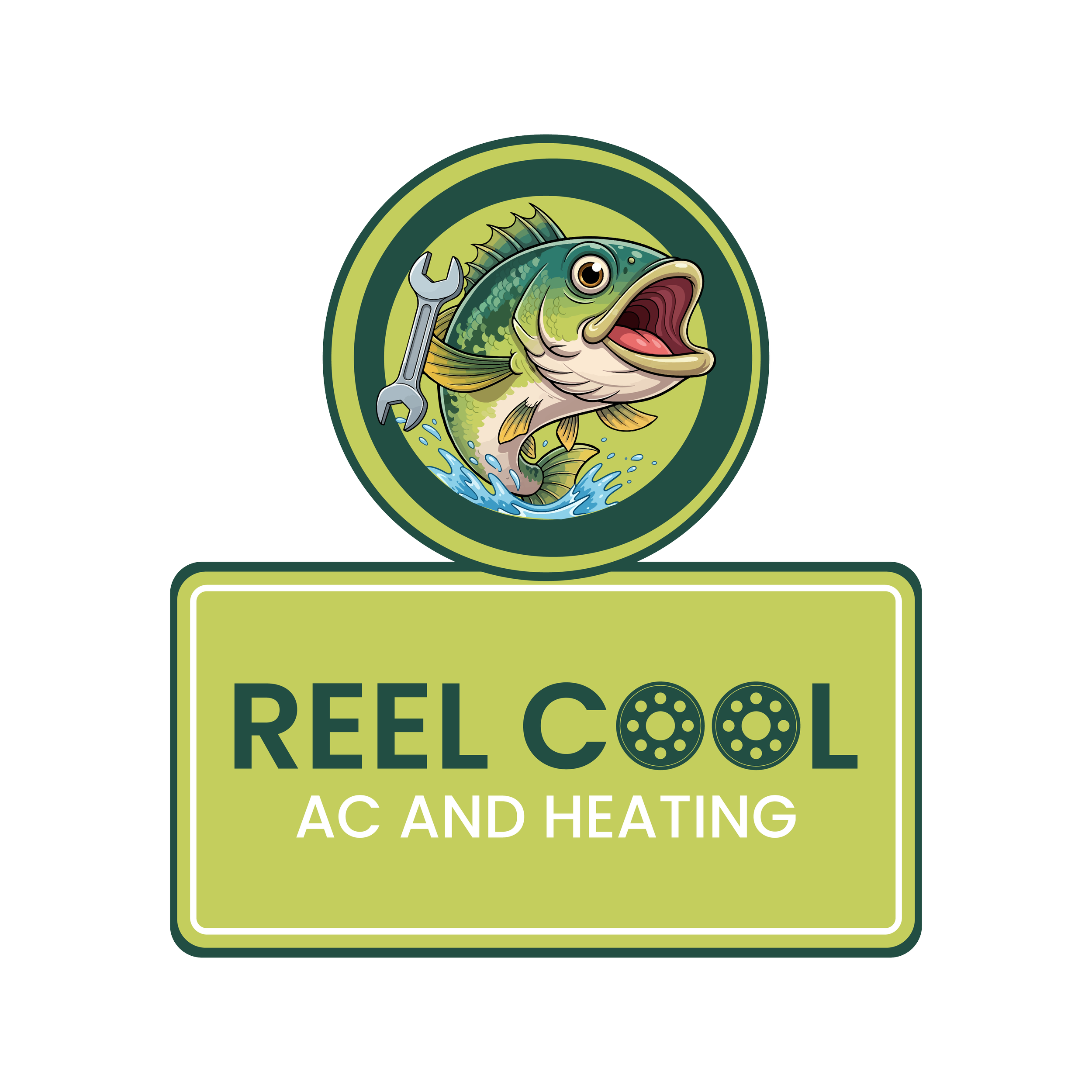 Logo for Reel Cool AC and Heating featuring a fish with a wrench in its fin, jumping out of water, above the text 'Reel Cool AC and Heating' in green and white letters.
